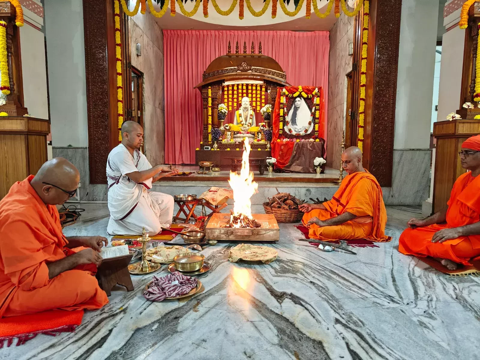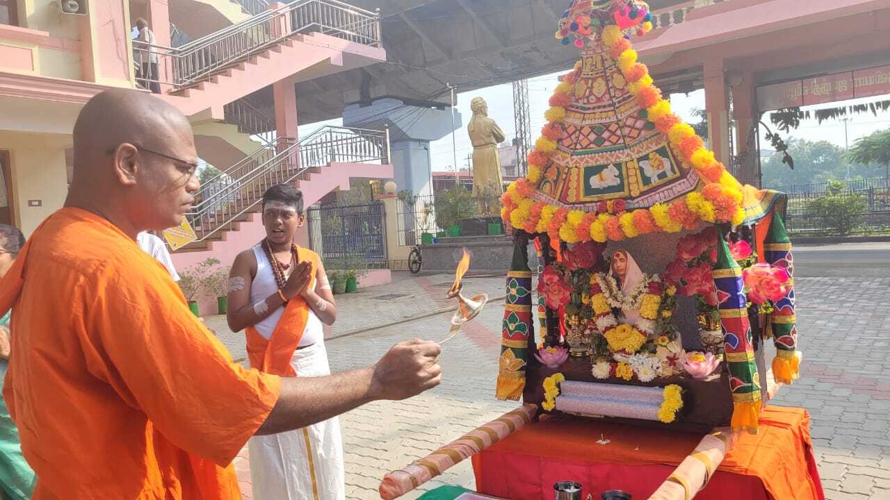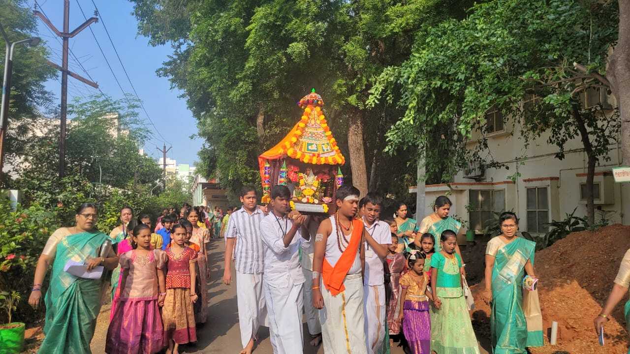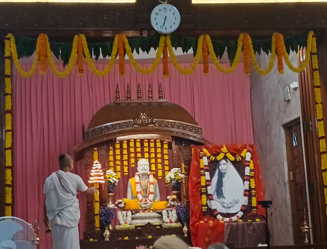 Bhajans were sung from 8:30 am to 10:20 am. Students and teachers carried Holy Mother Sri Sarada Devi's portrait in a procession, singing Namavalis, from the school to the temple prayer hall and performed Bhajans at the temple. The homa, a sacred fire ritual, took place at 10:30 AM. Following this, at 11:15 AM Swami Nityadipananda delivered a discourse on the life and teachings of Holy Mother, highlighting her message of compassion and selfless service, inspiring the assembled devotees.