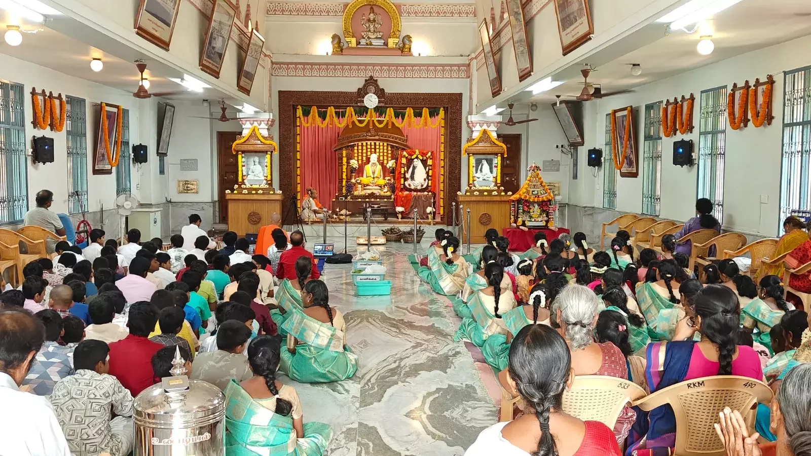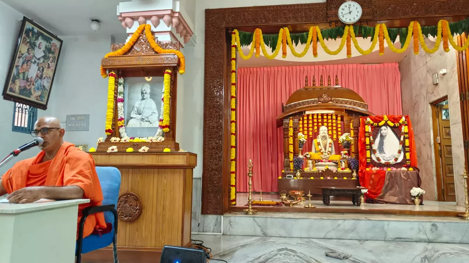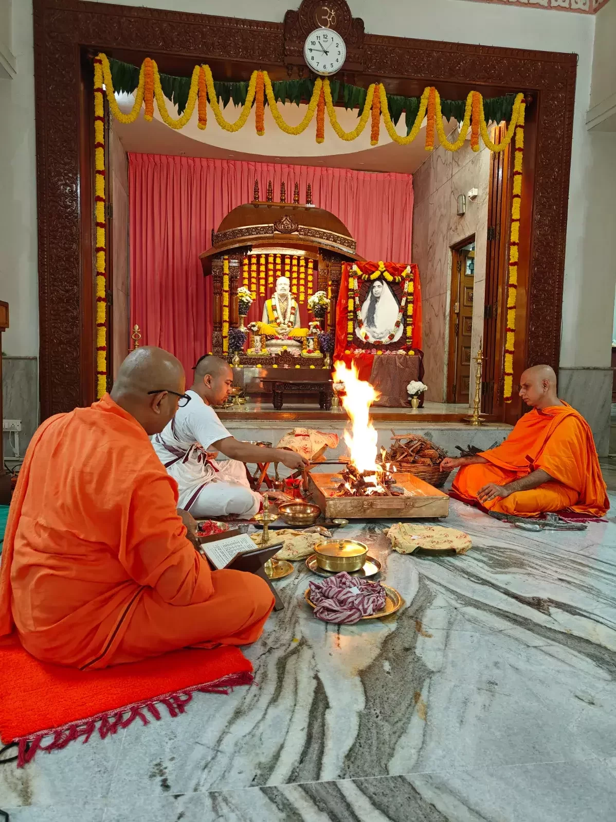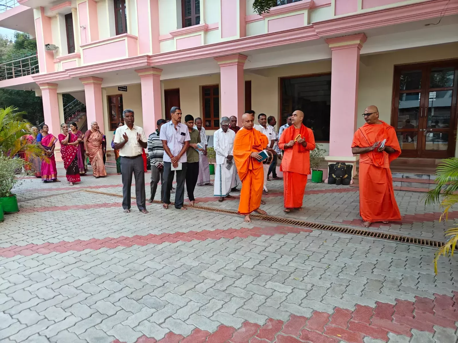 Bhajans were sung from 8:30 am to 10:20 am. Students and teachers carried Holy Mother Sri Sarada Devi's portrait in a procession, singing Namavalis, from the school to the temple prayer hall and performed Bhajans at the temple. The homa, a sacred fire ritual, took place at 10:30 AM. Following this, at 11:15 AM Swami Nityadipananda delivered a discourse on the life and teachings of Holy Mother, highlighting her message of compassion and selfless service, inspiring the assembled devotees.