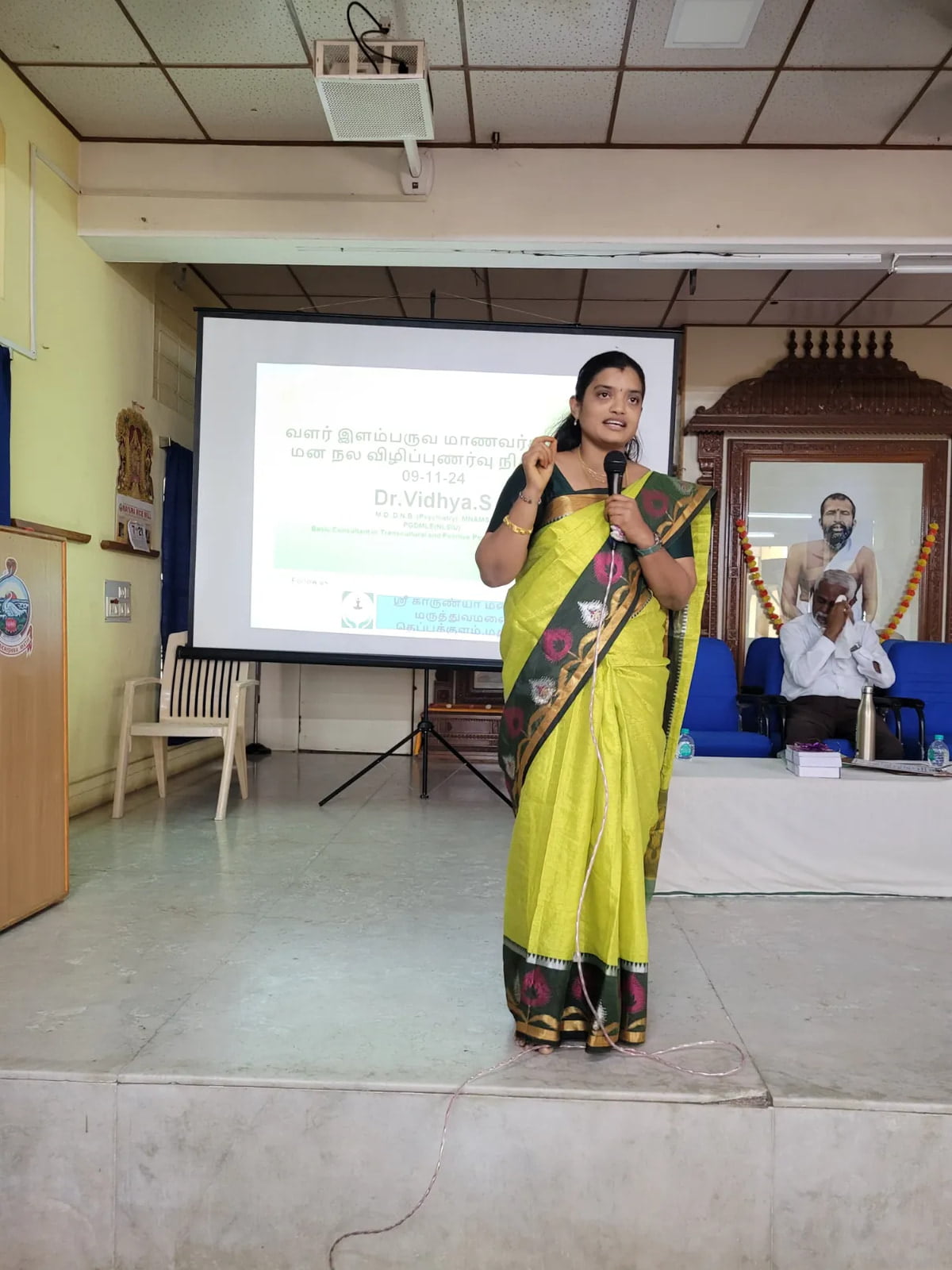 2. Dr. Vidya (M.D., MNAMS, PGDMLE), a Consultant Psychiatrist and Psychotherapist from Karunya Clinic, addressed "Students' Psychological and Behavioral Issues and Their Remedies". Her talk focused on common behavioral challenges in adolescents and offered practical strategies for addressing them. She highlighted the value of empathy and open communication in helping adolescents cope with stress, peer pressure, and self-esteem issues.