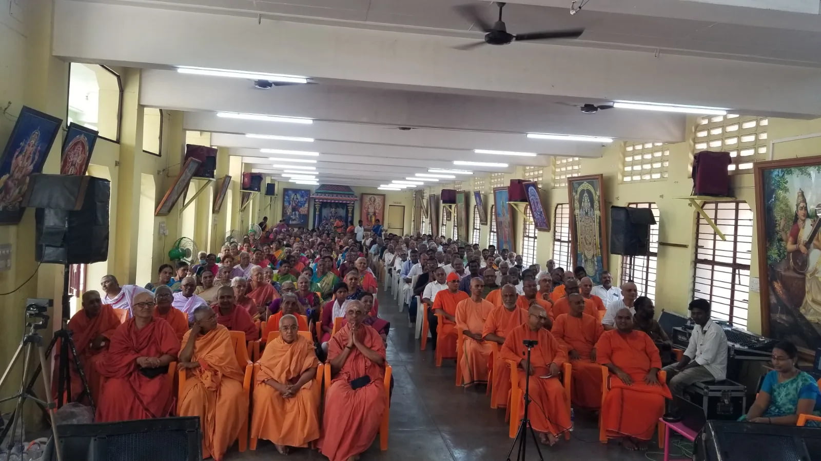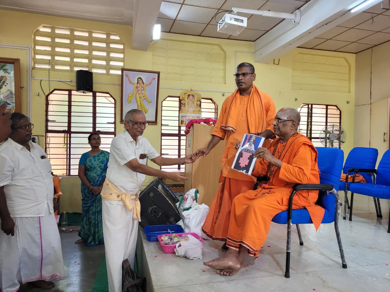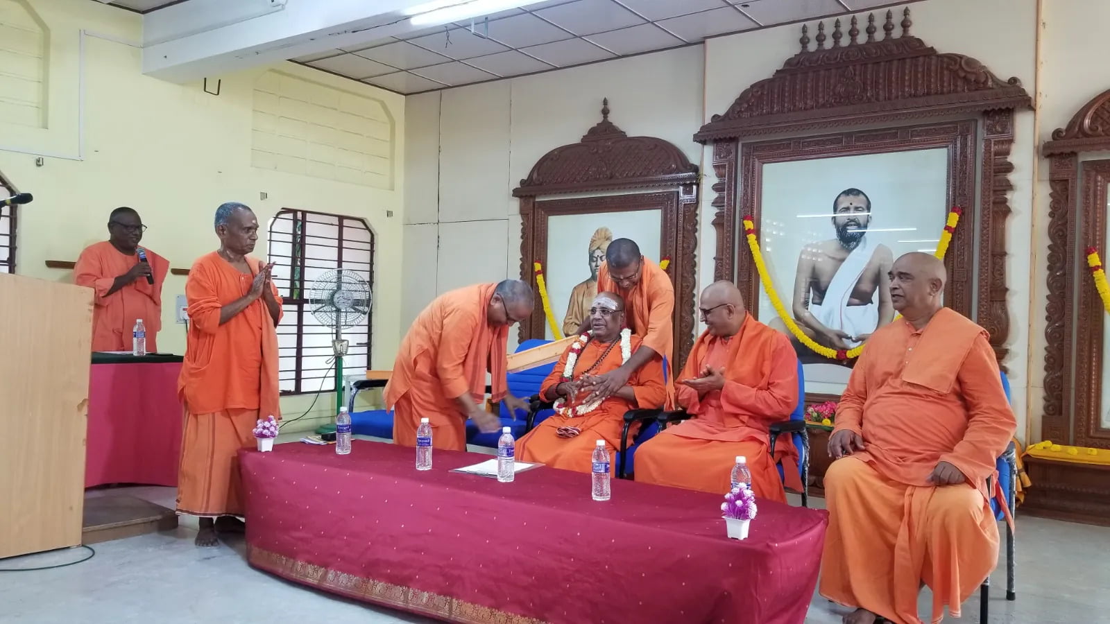 Following the formal handover, a public meeting was arranged from 9:30 am to 2:00 pm in the Sarada Vidyalaya prayer hall to introduce Swami Nityadipananda to the devotees and to honor Srimat Swami Kamalatmanandaji Maharaj for his exemplary service to Madurai Math and the devotees of Tamil Nadu over the past 24 years.