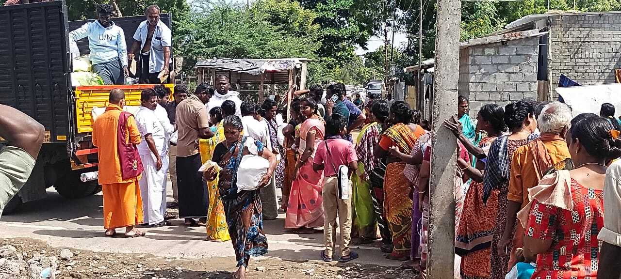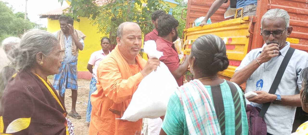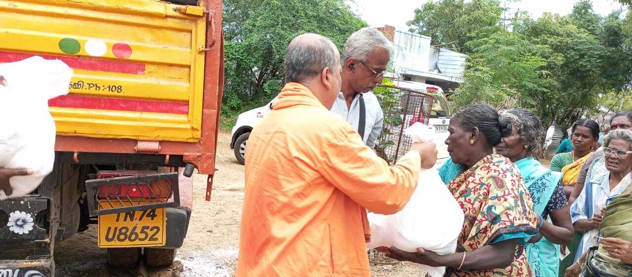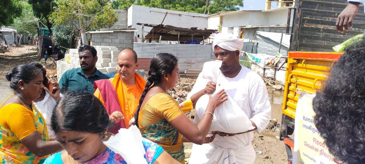 Sri Ramakrishna Math Madurai and Sri Ramakrishna Math Chennai have been working together to provide flood relief services in the flood-affected areas of Tirunelveli and Tuticorin districts. From December 24th to 27th, we distributed relief kits containing essential items to 4,000 families. These kits included rice, pulses, sugar, salt, cooking oil, masala powder, semolina, and water.